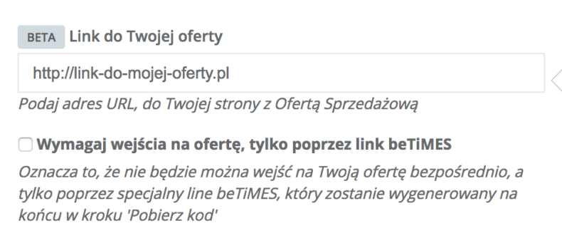 Możesz skorzystać z przekierowania do Twojej oferty za pośrednictwem beTiMES. W kroku pierwszym (screen powyżej), wklej pełny link do oferty, dla której tworzysz kampanię.