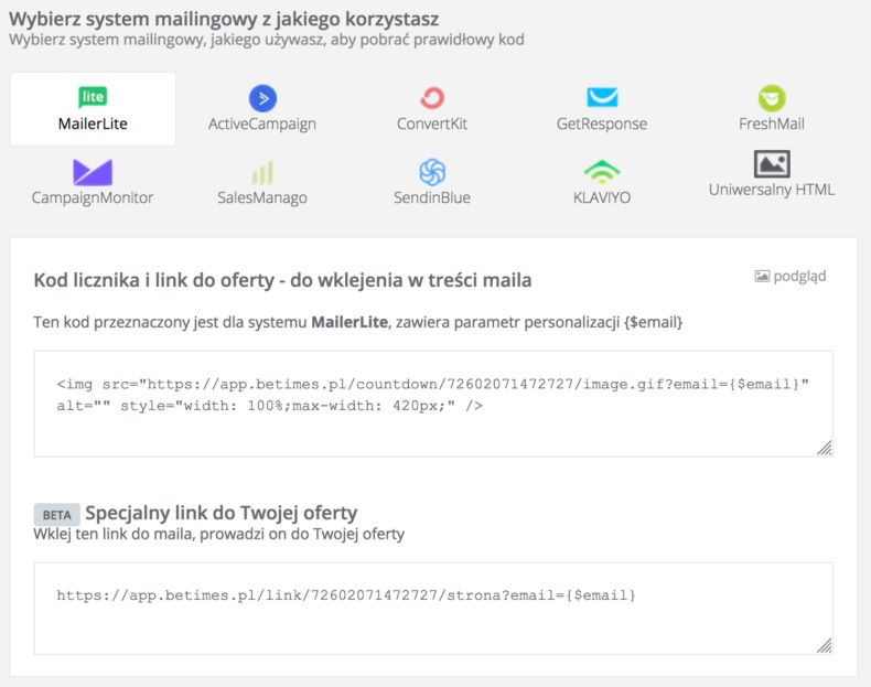 Dzięki temu, w ostatnim kroku “Pobierz kod”, otrzymasz gotowy link do oferty, do wklejenia do Twojego systemu mailingowego.